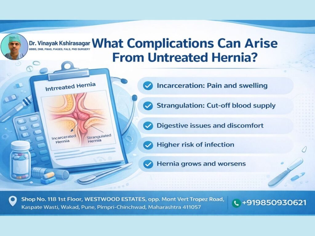 A hernia may seem like a small issue, but if left untreated, it can lead to serious problems. Dr. Vinayak Kshirsagar, a trusted General Surgeon in Wakad, explains that one of the biggest risks of not treating a hernia is when it becomes stuck, which is called incarceration. This can cause constant pain and swelling. In some cases, it can worsen and cause more dangerous issues, like cutting off the blood supply to the trapped tissue, a condition known as strangulation.
